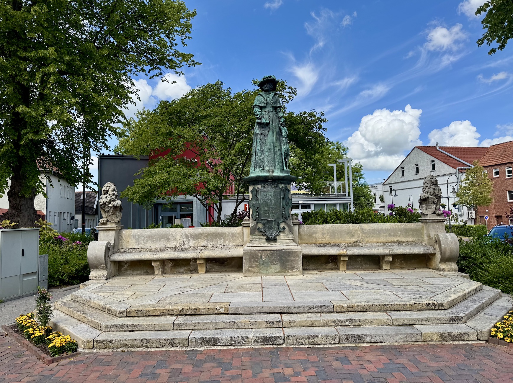 Das Denkmal von „Fräulein Maria“ befindet sich unmittelbar in der Nähe des Schlosses. Die Statue ist aus Bronze gegossen, wiegt ca. 550 Kilogramm und ist ca. 2,20 Meter groß. In der rechten Hand hält Maria die Urkunde zu Verleihung der Stadtrechte, die linke Hand liegt auf dem Kopf eines ihrer Jagdhunde.