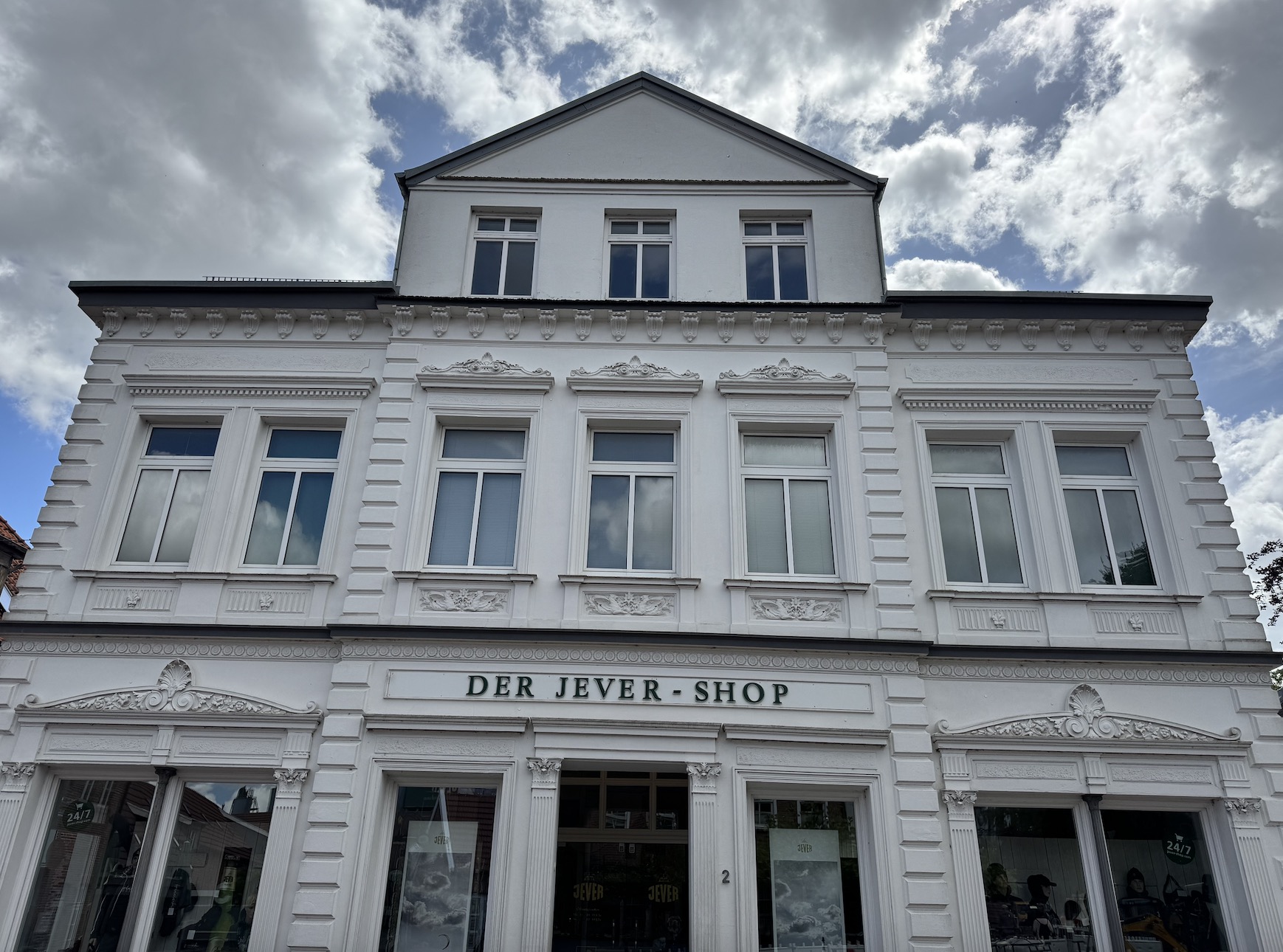 Ich bog vom Markt rechts in die Fußgängerzone in der Neuen Straße ein. Trotz aktueller Bauarbeiten, konnte ich hier entspannt bummeln gehen. In der Tat lohnte sich oft auch der Blick nach oben, um die schönen Fassaden zu bestaunen. Die Straßengemeinschaft „Jever Zentrum“ schließt die Betriebe in dieser und der Schlachtstraße zusammen. Sie deckt das breite Angebot des täglichen Bedarfs, aber auch Mitbringseln perfekt ab.