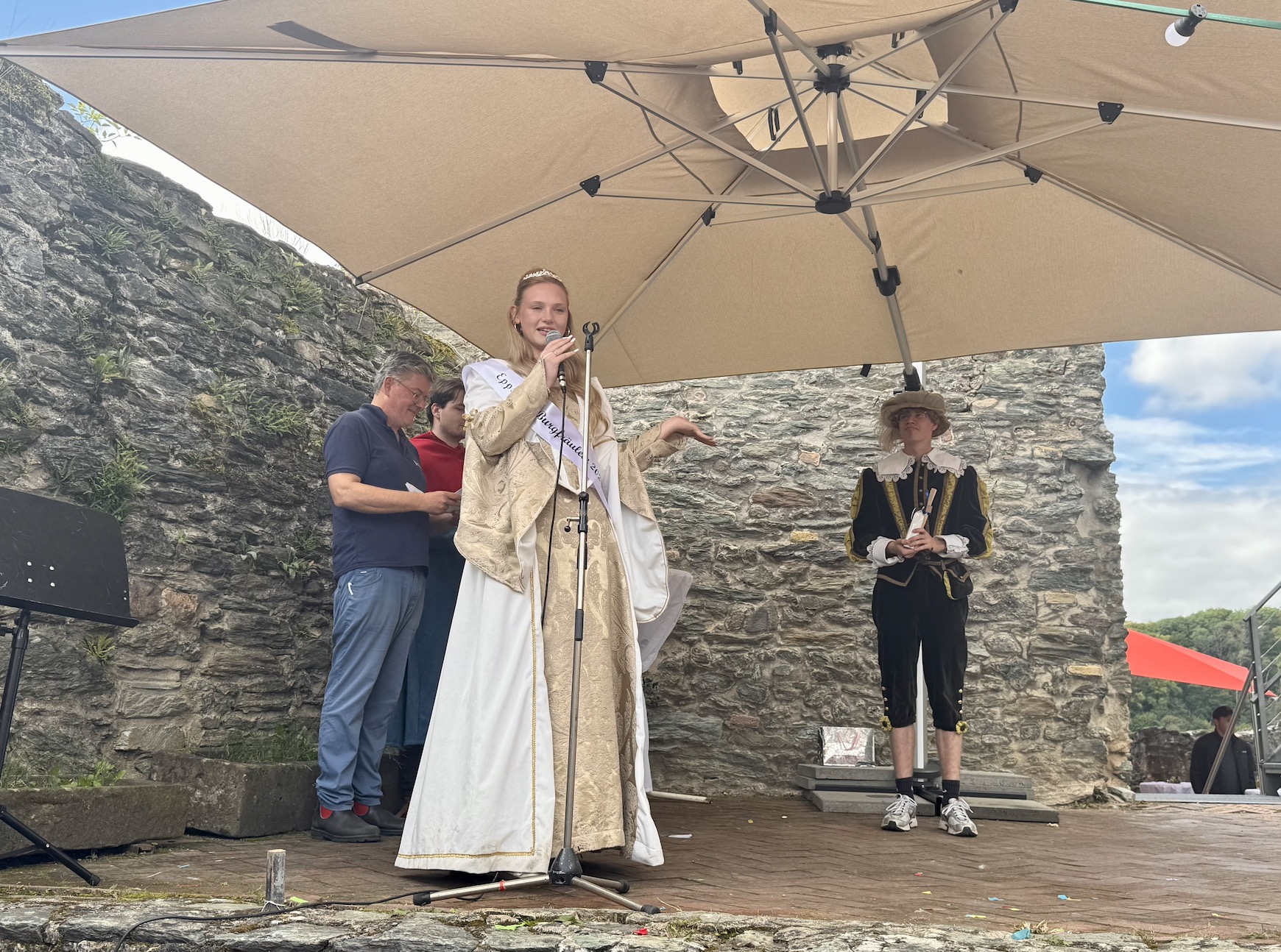 Schließlich konnte Schirmherr Philipp Fürst zu Stolberg-Werningerode dann doch noch die Zeremonie fortführen und aus dem Publikum gab es viel Applaus. Nathalie dankte Friseur und Stylist Markus Meiners von Spectacoolhair aus Vockenhausen, der sie uneentgeltlich frisiert hatte. Ebenso dankte sie Nicole Mackovic für die Organisation und Schneiderin Ela van der Heijdem vom Königsteiner Burgverein. Das Kleid des neuen Burgfräuleins war vor dem Event ein gut gehütetes Geheimnis gewesen.