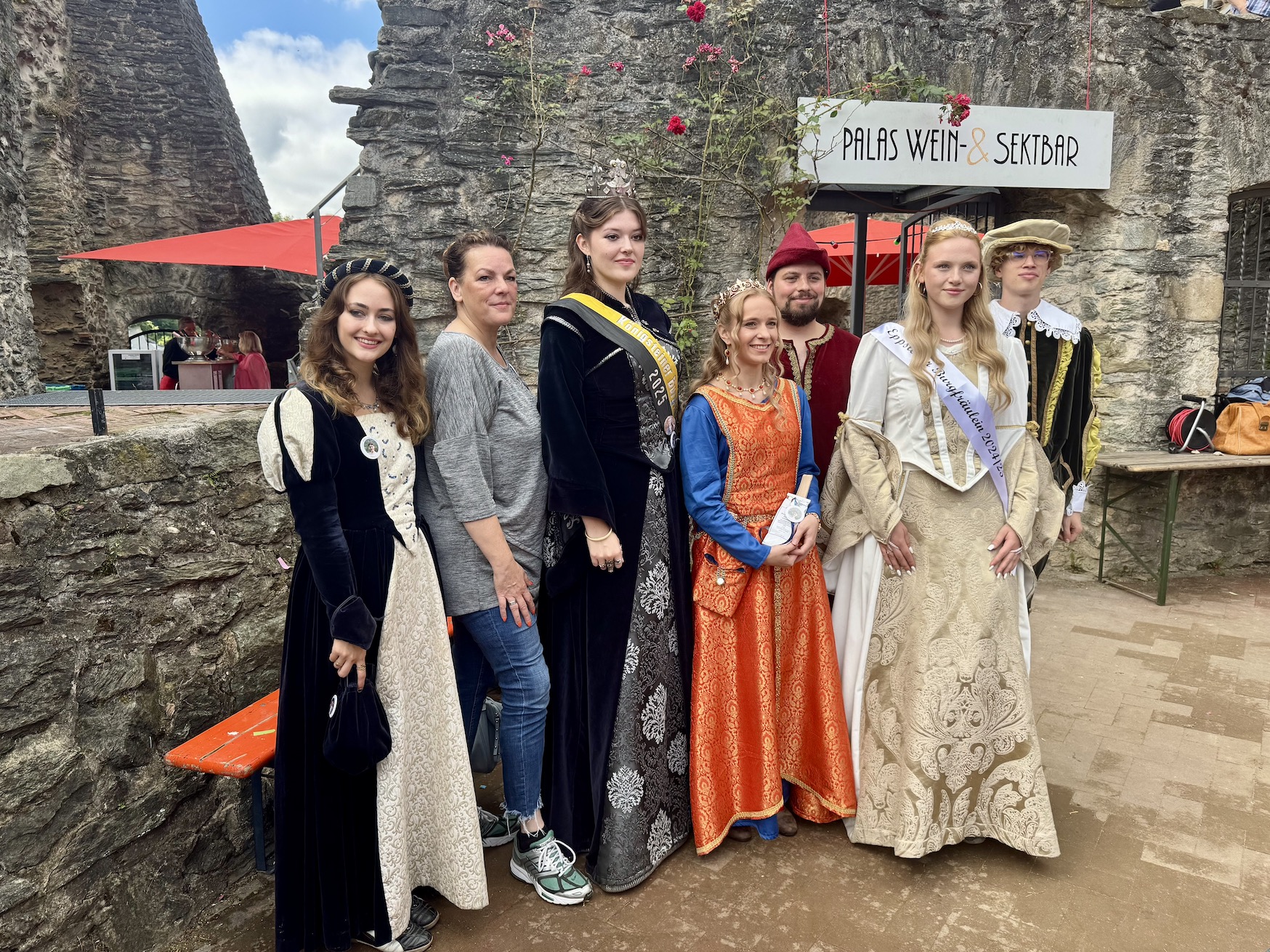 Nach der Krönung ergab sich dann auf der „Bühne“ der Burgfestspiele von Burg Eppstein dieses schöne Gruppenbild. Von links nach rechts: Hofdame Victoria, Ela van der Heijdem, Burgfräulein Malva I., Burgfräulein Nathalie, Junker Patrick, Burgdame Luise I. und Junker Daniel.