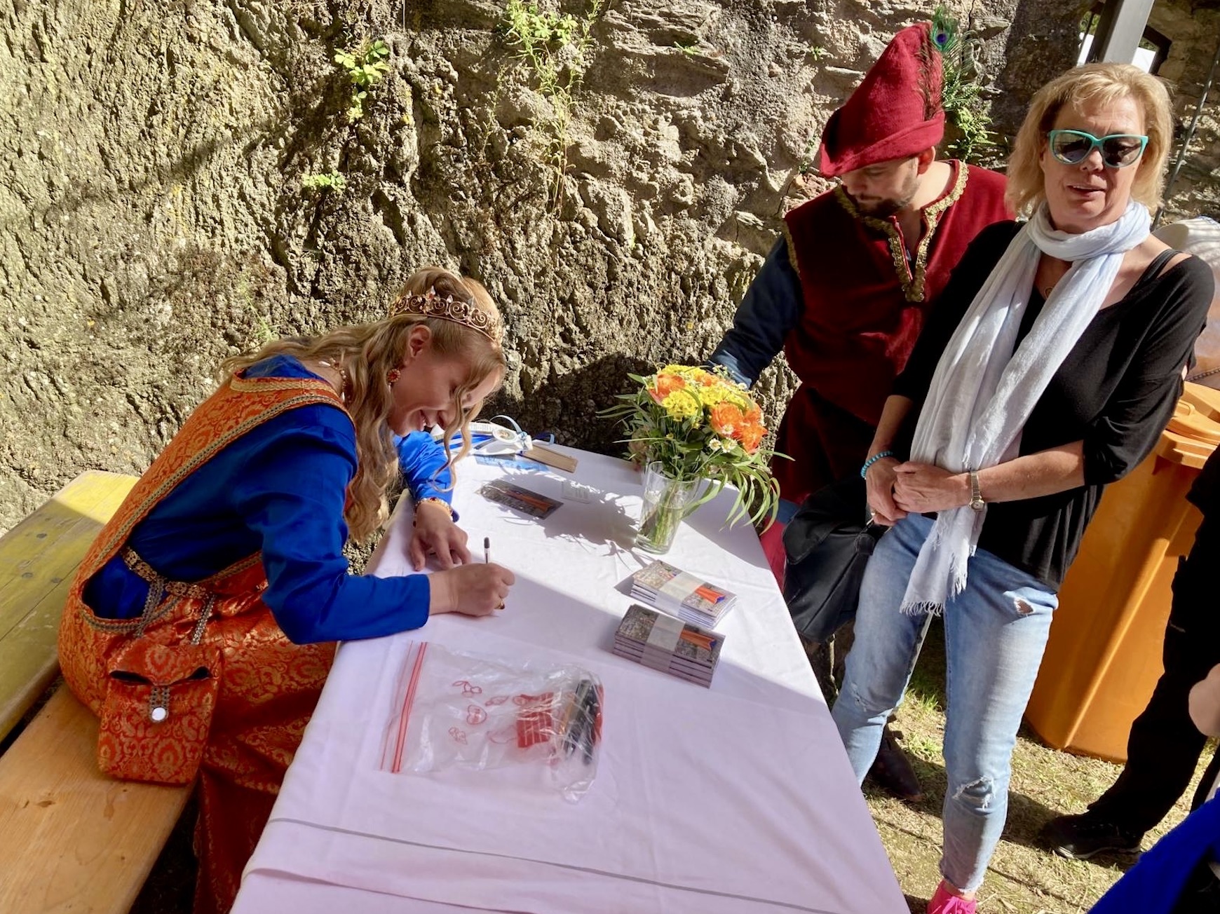 Nach ihrer Krönung gab Nathalie I. eine lange Zeit Autogramme. Ich war glücklich, eine der Ersten in ihrer Schlange zu sein. Entspannt plauderte ich noch eine Weile mit unserem neuen Burgfräulein. Sie wird auch bei der Eppsteiner Büchermesse am 22.11.25 in der Musikschule dabei sein und sich zwischen den Messeständen der Aussteller bewegen. Burg Eppstein und das Burgmuseum werden an diesem Tag für Besucher bis 15 Uhr geöffnet sein.