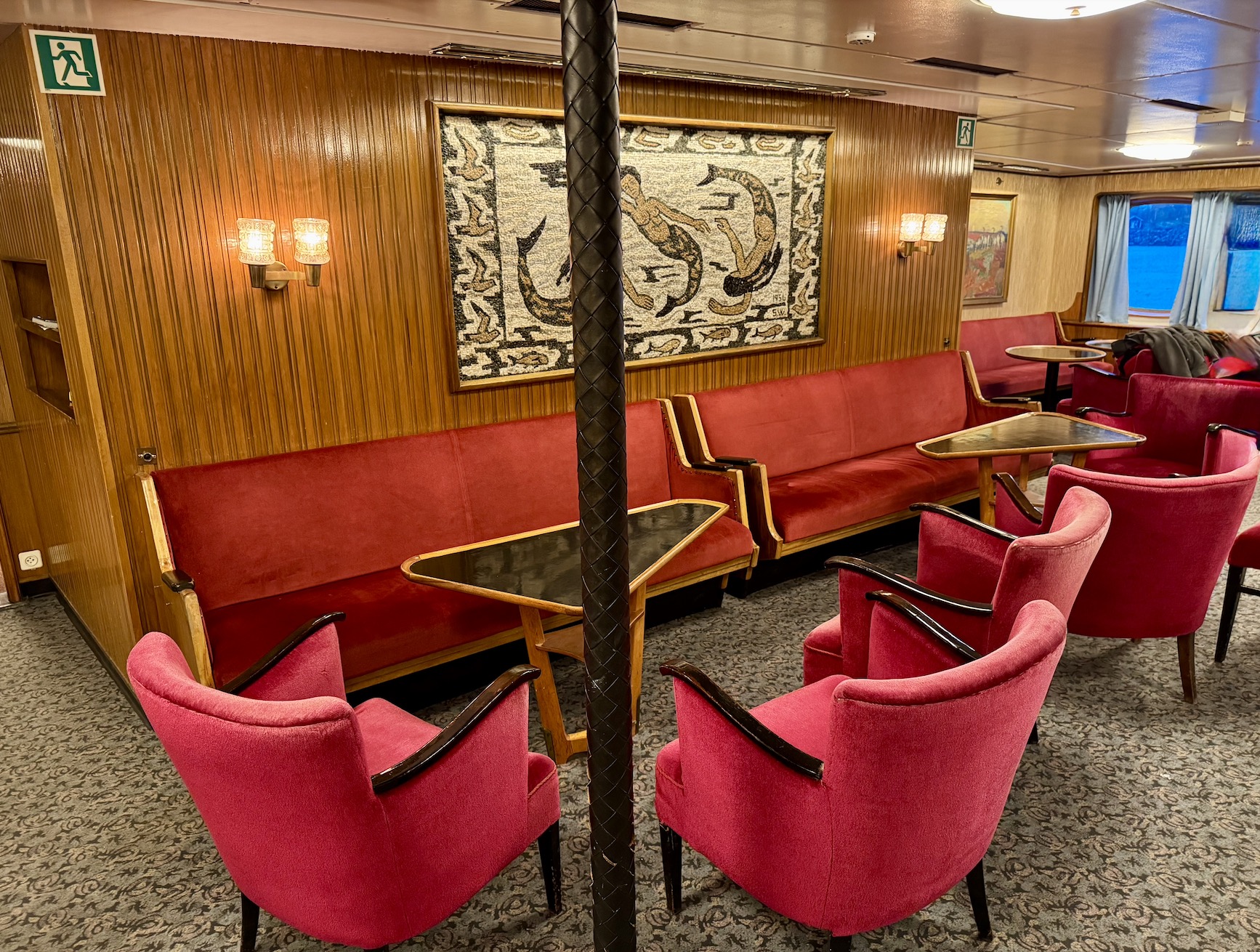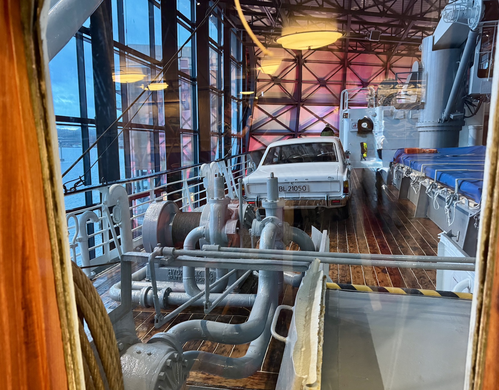Beim Schlendern über die Außendecks, die mit Teakholz ausgestattet waren, fühlte ich sehr viel Seefahrernostalgie und Geschichte. Der Stapellauf der Finnmarken war in Hamburg bei Blohm & Voss im Jahre 1956. Ein echter Hingucker ist natürlich auch der Ford 17 M von 1971, der auf dem Deck geparkt ist.