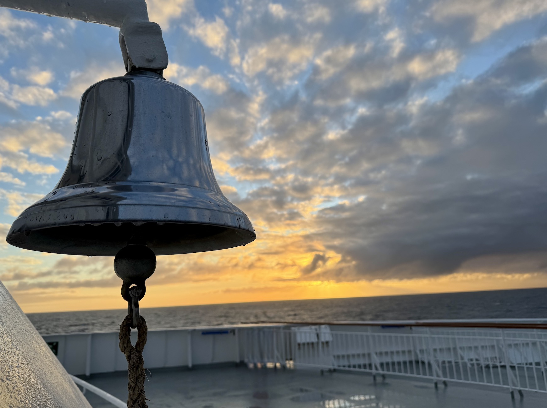 Den Sonnenaufgang habe ich auf dieser Reise öfter fotografiert, als den Untergang, was daran lag, dass es im Prinzip schon ab 16 Uhr dämmerte. Die Schiffsglocke auf Deck 5 ist natürlich dafür ein tolles Motiv. An diesem Morgen war es auf dem Vordeck, was jederzeit betreten werden kann, noch sehr leer.