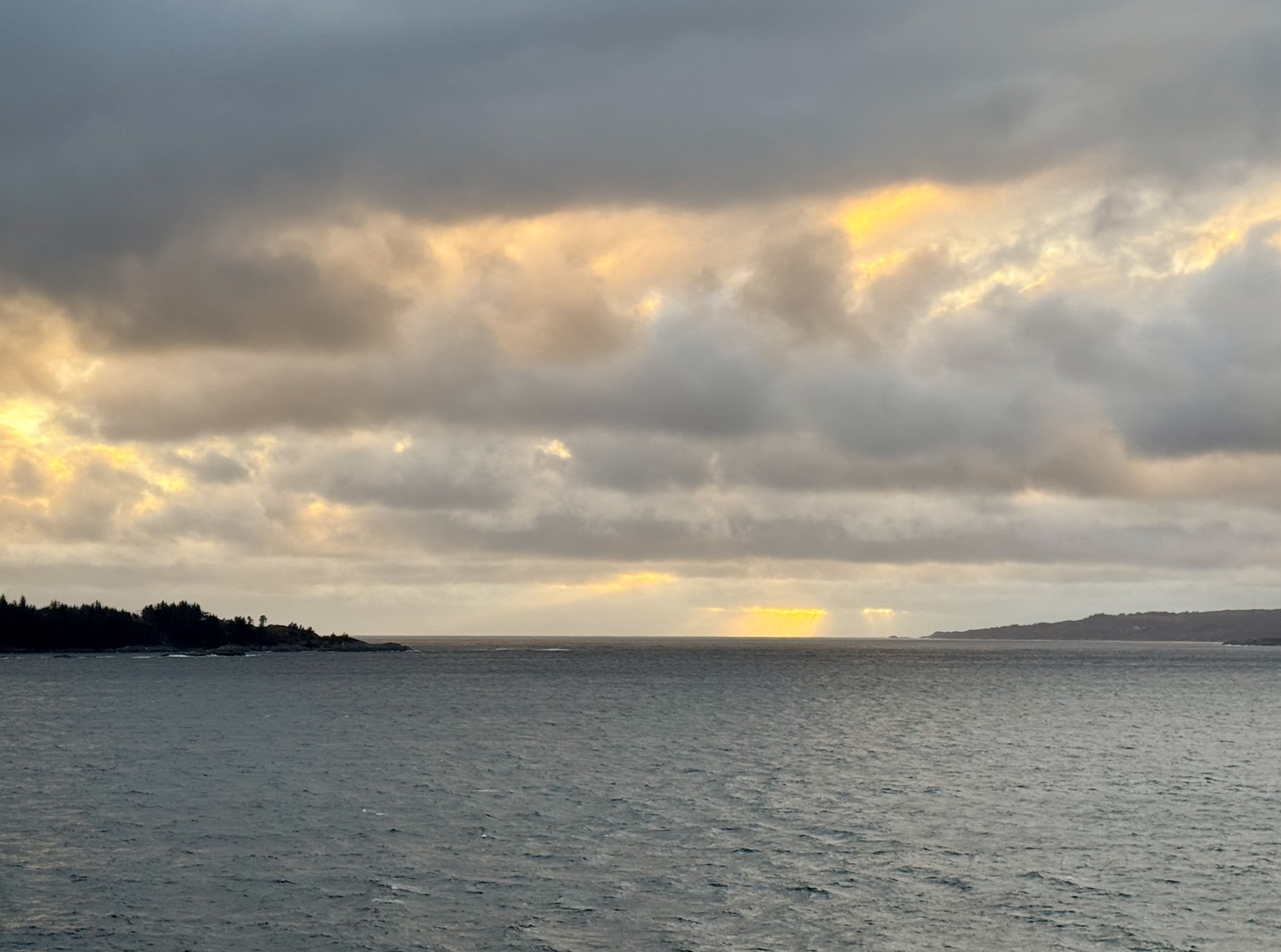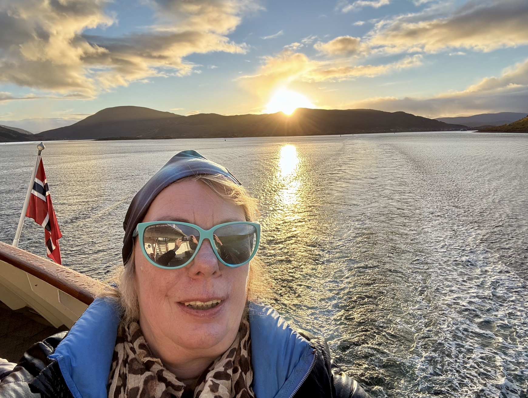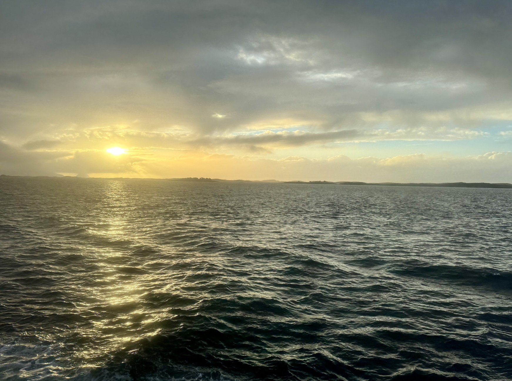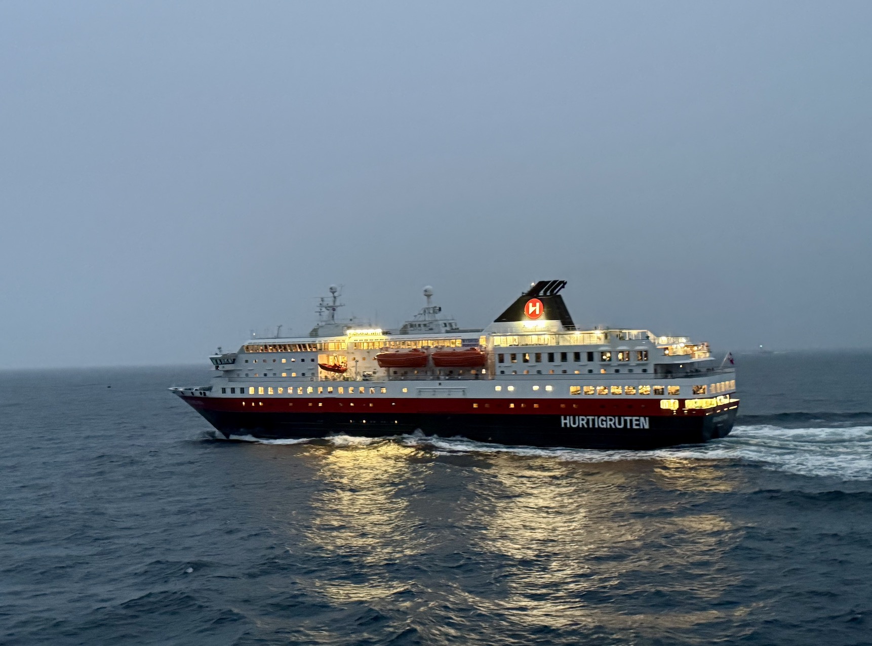 Während ich auf dem ersten Bild noch hoffte, dass die Sonne ins Meer platschen würde, war sie dann auch schon weg in den Wolken. Dafür kam kurz danach „Richard With“ – ein anderes Hurtigruten-Schiff – vorbei und die Schiffe begrüßten sich natürlich mit ihren Schiffshörnern.