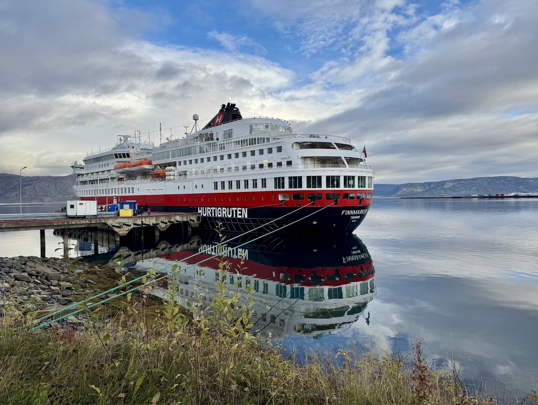 Alta war für mich auf der Reise ein neuer Hafen. Wir lagen mit der MS Finnmarken ein wenig von der Stadt entfernt an diesem landschaftlich schönen Liegeplatz. In die Stadt fuhr uns problemlos ein Shuttlebus. Das Wetter war durchwachsen, aber dafür untermalen die wilden Wolken sehr schön die Spiegelung des Schiffes im Wasser.
