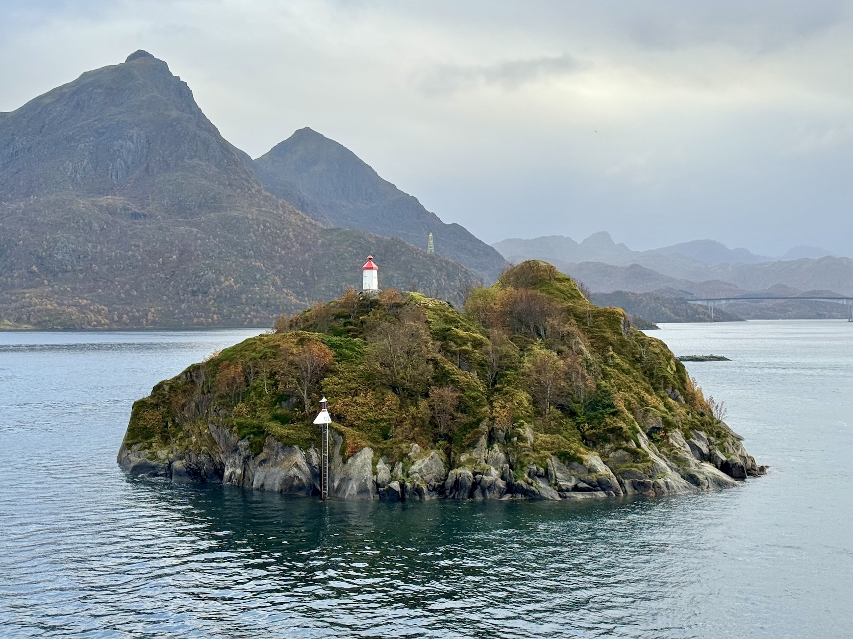 Auch am Seetag war das Wetter nicht immer sonnig. Diese kleine Insel mit dem Seezeichen sieht aus wie Norwegen im Kleinformat. Der Indian Summer verfärbte die Natur bereits schön und die scheinbar dunklen Berge gaben einen guten Kontrast.