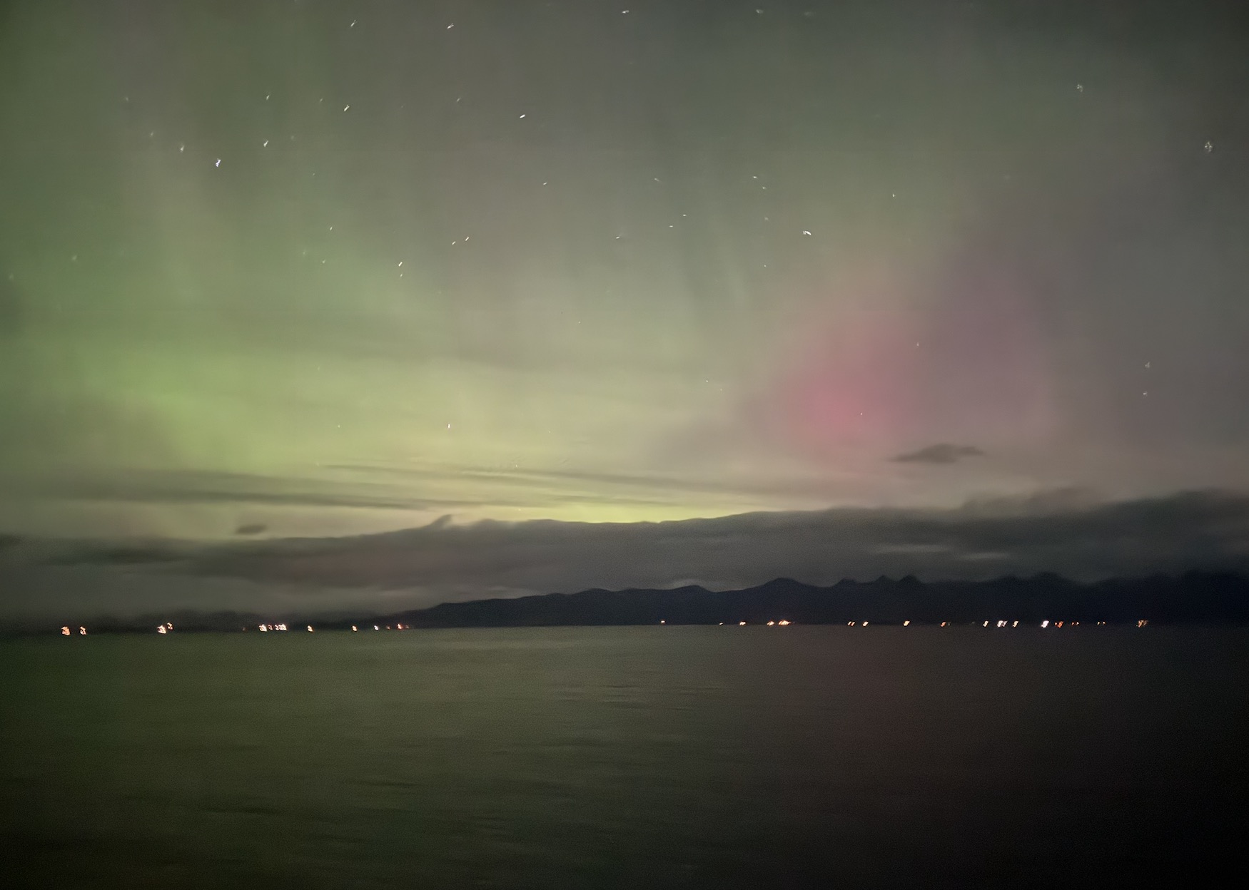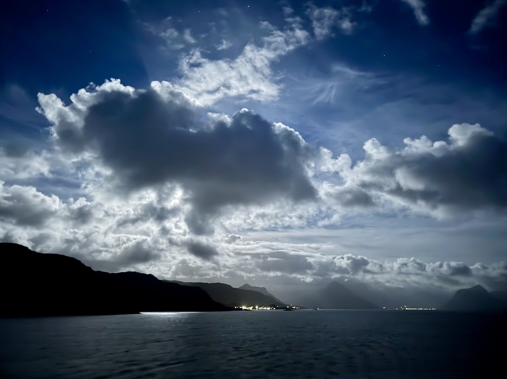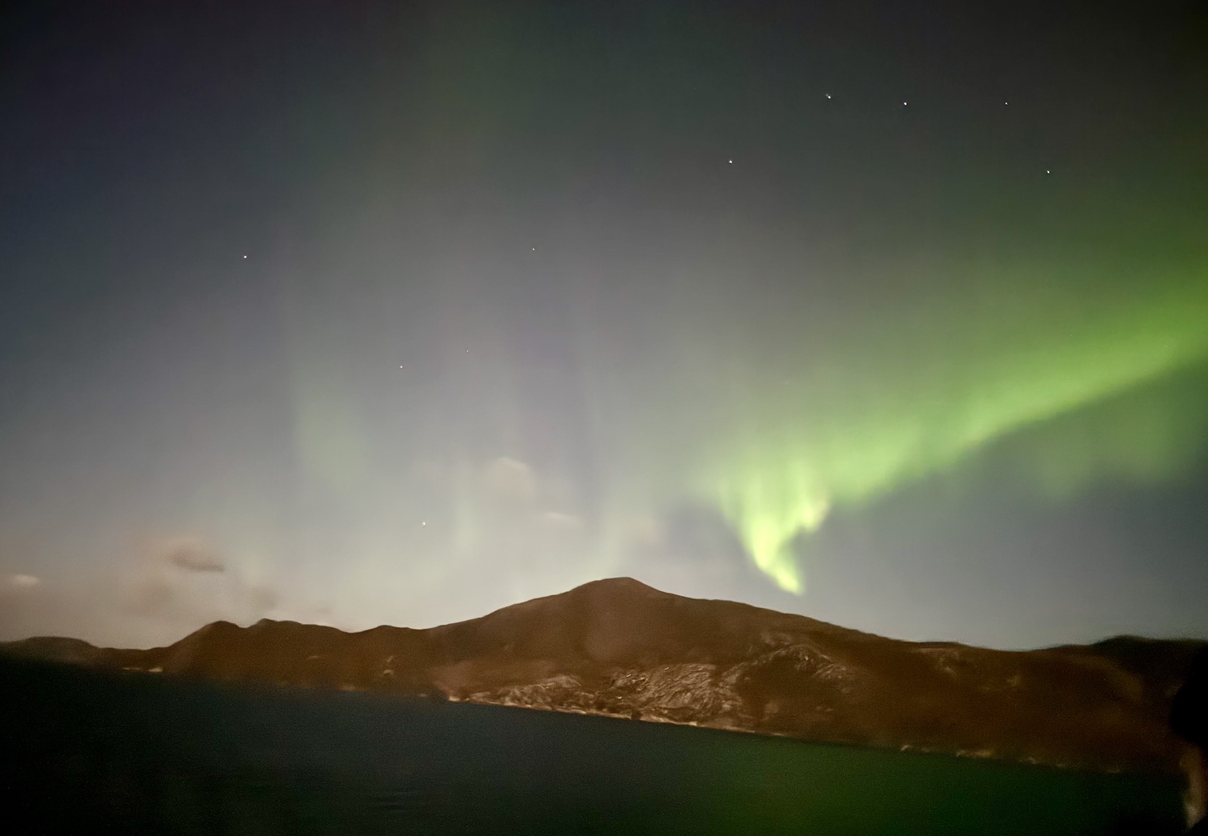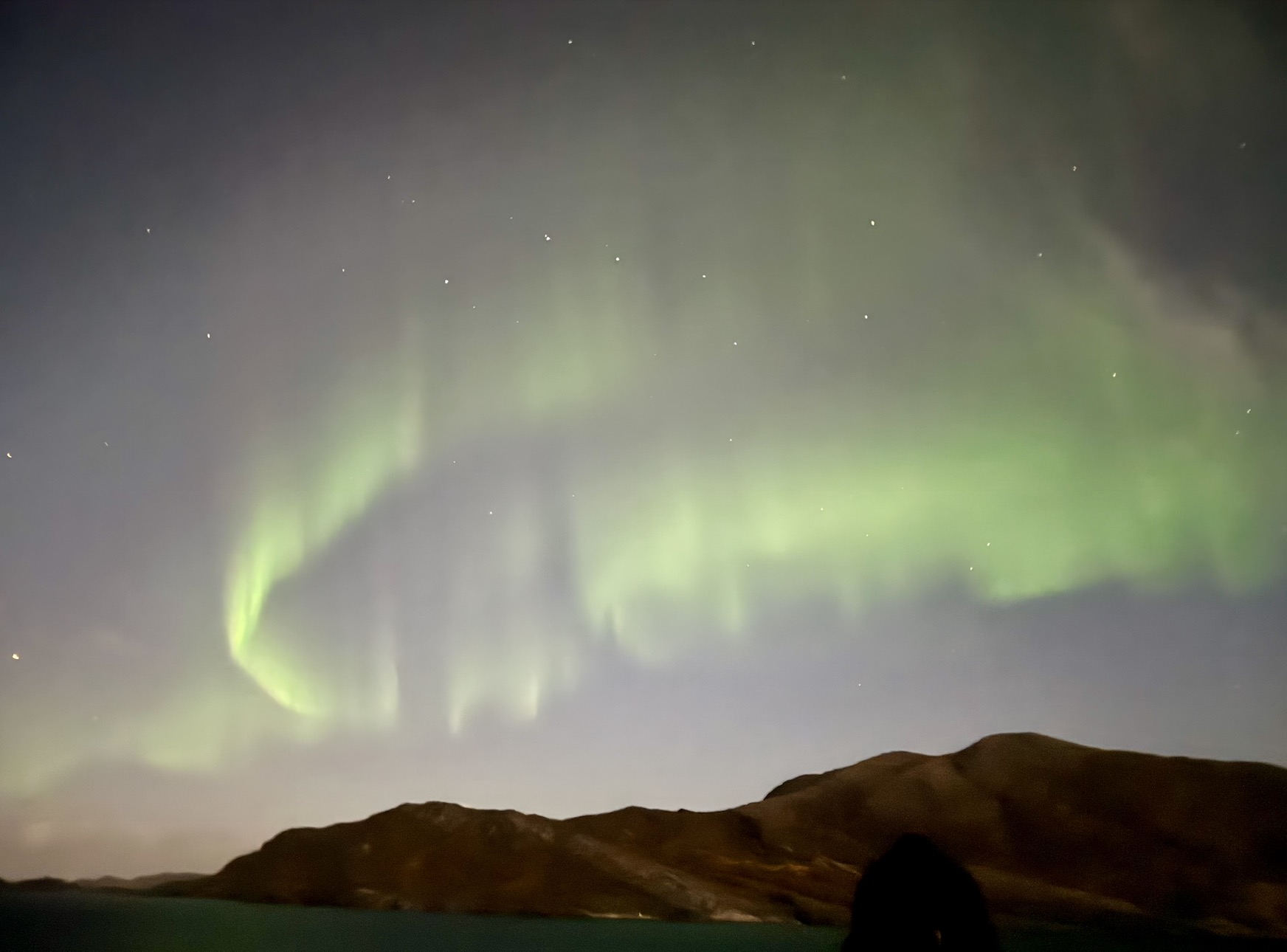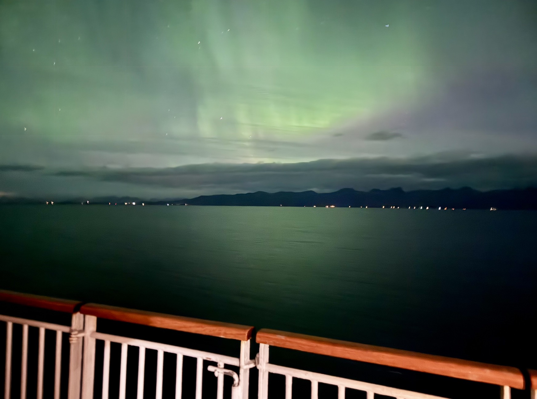 Wir hatten gerade auf der Steuerbordseite die Insel Vikingen auf der eine Kugel den Polarkreis markiert passiert, als die Durchsage von der Brücke kam, dass nun auf der Backbordseite die ersten Polarlichter zu sehen sind. Es war wie Magie und auf Deck brach eine wahre Euphorie aus. Diese ersten Lichter waren allerdings nur durch das Smartphone sichtbar.