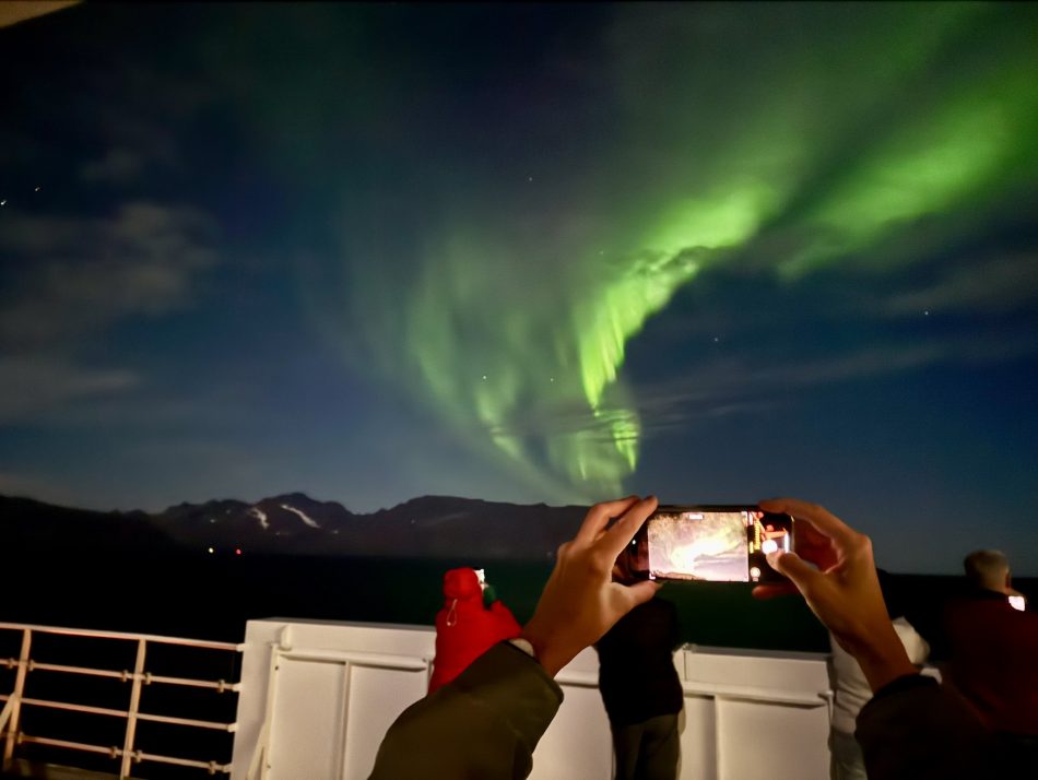 Wir hatten gerade auf der Steuerbordseite die Insel Vikingen auf der eine Kugel den Polarkreis markiert passiert, als die Durchsage von der Brücke kam, dass nun auf der Backbordseite die ersten Polarlichter zu sehen sind. Es war wie Magie und auf Deck brach eine wahre Euphorie aus. Diese ersten Lichter waren allerdings nur durch das Smartphone sichtbar.