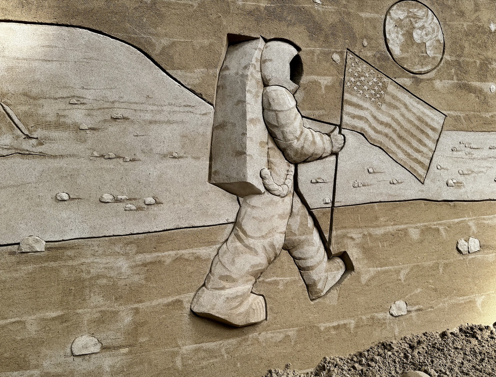 Auch Neil Armstrong als erster Mensch auf dem Mond ist aus Sand nachgeformt.. Am 21. Juli 1969 betritt er als erster Mensch den Mond. Die Landung der „Apollo 11“-Mission war das Finale eines Wettlaufs zwischen der Sowjetunion und Amerika.
