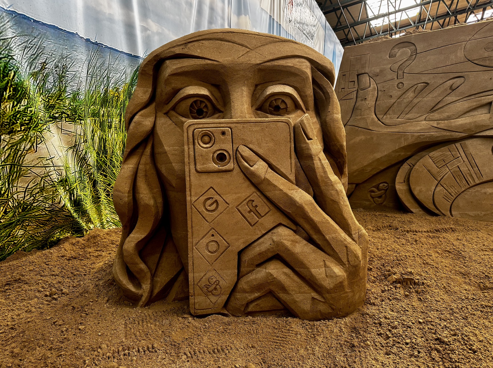 Selfies sind aus den modernen Medien kaum mehr wegzudenken. Und so findet sich zum Schluss der Ausstellung in der jetzigen Zeit angekommen, eine Selfie-Figur aus Sand. Das erste fotografische Selbstporträt wurde tatsächlich von Robert Cornelius 1839 aufgenommen vor dem Gasbeleutungsgeschäft seiner Familie. Er wollte damals damit eine neue Fototechnik testen.